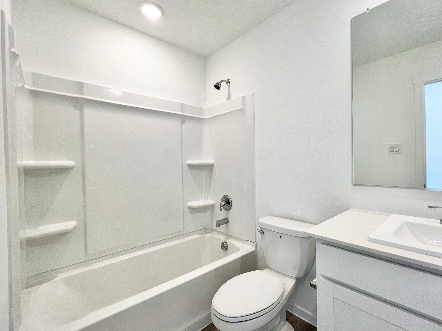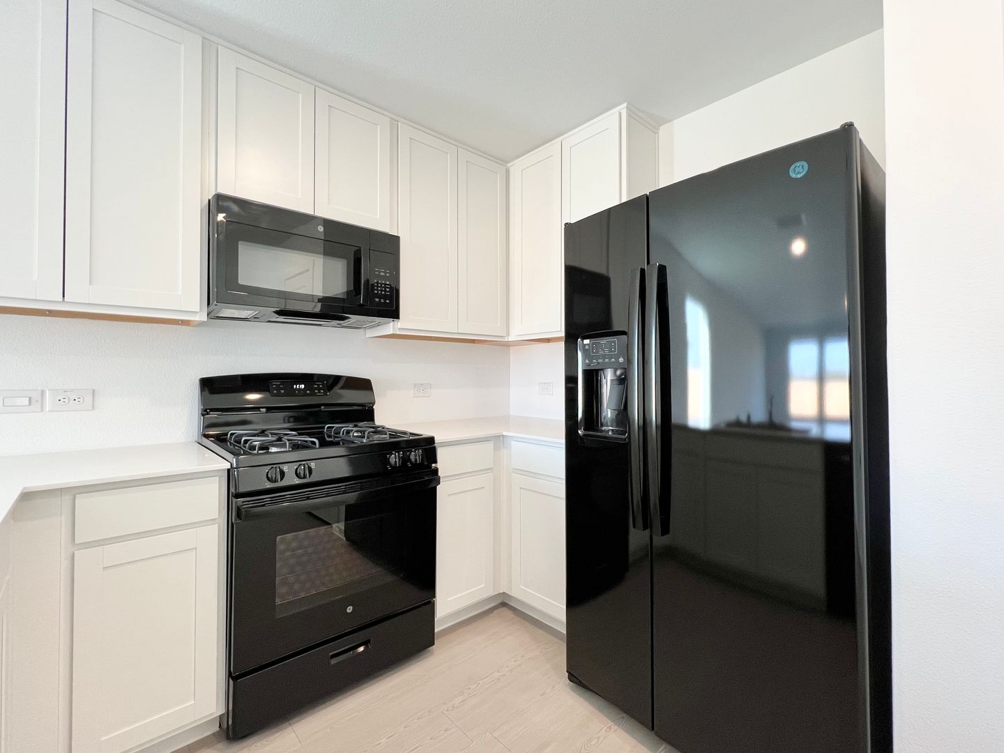 The kitchen shines with granite-style countertops and comes fully equipped with brand-new appliances, including a refrigerator, microwave, dishwasher, and electric range-oven. The primary suite is also located on the first floor, offering a peaceful retreat with a generous walk-in closet and a private en-suite bathroom.
